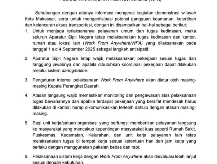 Pertama, ASN Makassar tetap melaksanakan tugas kedinasan dari kantor, rumah, atau lokasi lain (Work From Anywhere) pada 1–4 September 2025.