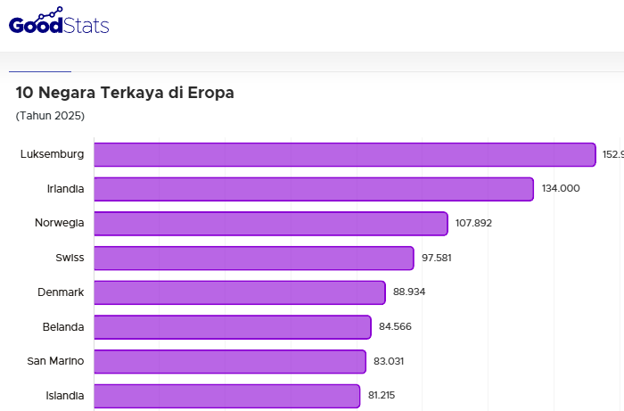 Tahun ini, dikutip dari GoodStats Minggu (14/9/2025), inilah daftar 10 negara terkaya di Eropa tahun 2025, berdasarkan pendapatan per kapita tertinggi.