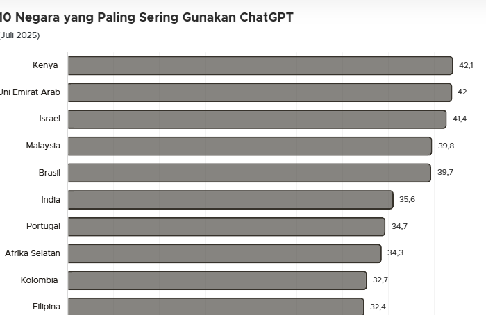 Menariknya, Kenya menempati posisi teratas dalam daftar negara yang paling sering menggunakan ChatGPT, dengan 42,1 persen pengguna internet berusia di atas 16 tahun rutin mengakses platform AI ini.